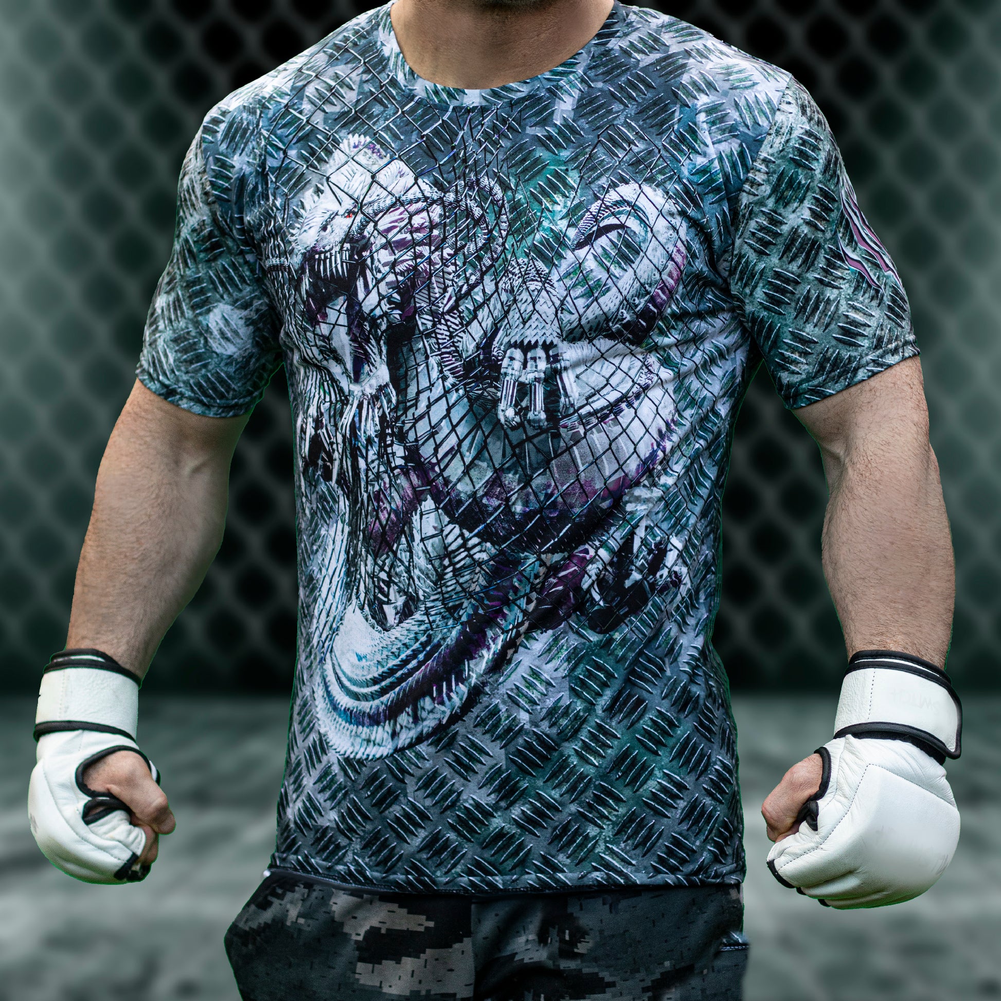This MMA-T shirt is 95% polyester, designed with a "Metal Clad" blueprint and available in men's sizes from Extra Small to 2Xlarge. The shirt is available in a stylish Blue Green colour. Get the perfect fit for your physique. Crafted with meticulous attention to detail, this T-shirt is tailored to perfection, ensuring a comfortable and flattering fit. The high-quality print covers the entire garment, showcasing the intricate nuances of the design and making it a true standout piece.