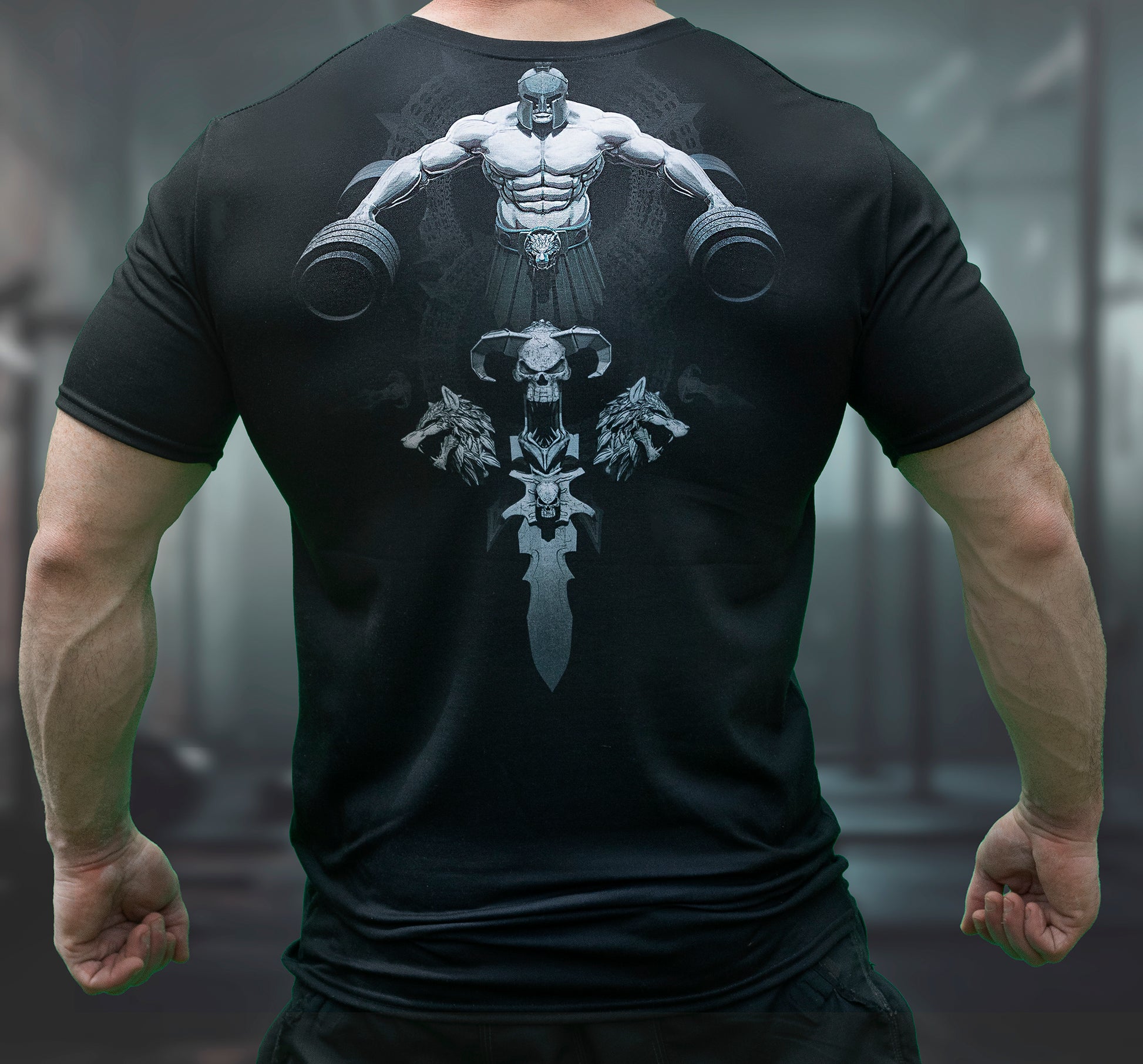 This Gym T shirt is 95% polyester, 5% elastane. designed with a 'Warrior lift' blueprint and available in men's sizes from Extra Small to 2Xlarge. The shirt is available in a stylish Black and grey color. Get the perfect fit for your physique. Crafted with meticulous attention to detail, this T-shirt is tailored to perfection, ensuring a comfortable and flattering fit. The high-quality print covers the entire garment, showcasing the intricate nuances of the design and making it a true standout piece.